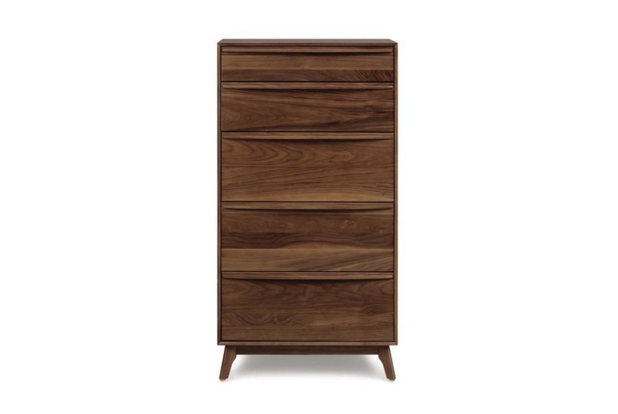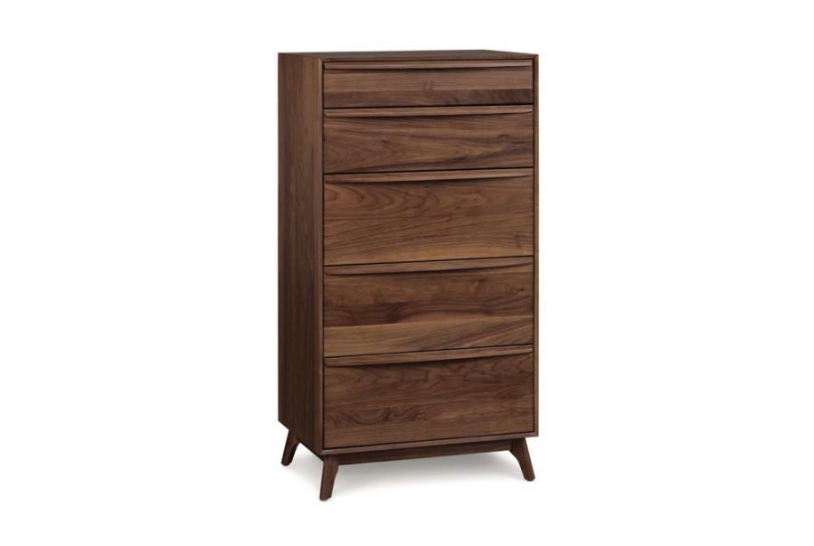 Catalina dressers and chests feature soft-close, self close drawer glides.The Catalina Bedroom is crafted in solid American black walnut hardwood with natural finish and Made to Order with a variety of knob or pull options. The Catalina Bedroom is also crafted in solid cherry with natural finish. The finish is GREENGUARD Certified for low chemical emissions.