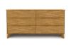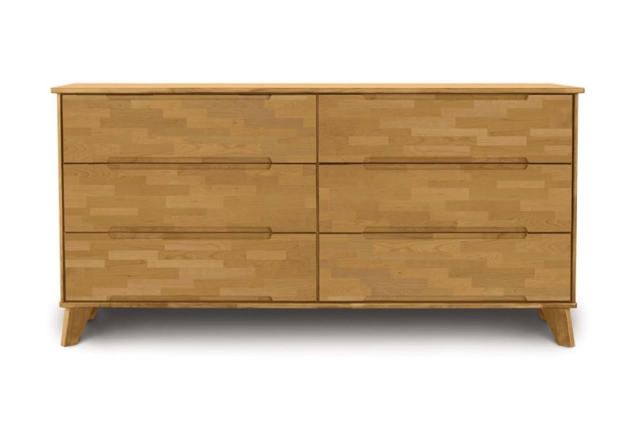 The Linn Bedroom is crafted in solid American cherry hardwood with a natural (pictured here) or saddle finish. Linn is also crafted in finger joined walnut or solid white oak (full length staves) and available in several finishes. The finish is GREENGUARD Certified for low chemical emissions.