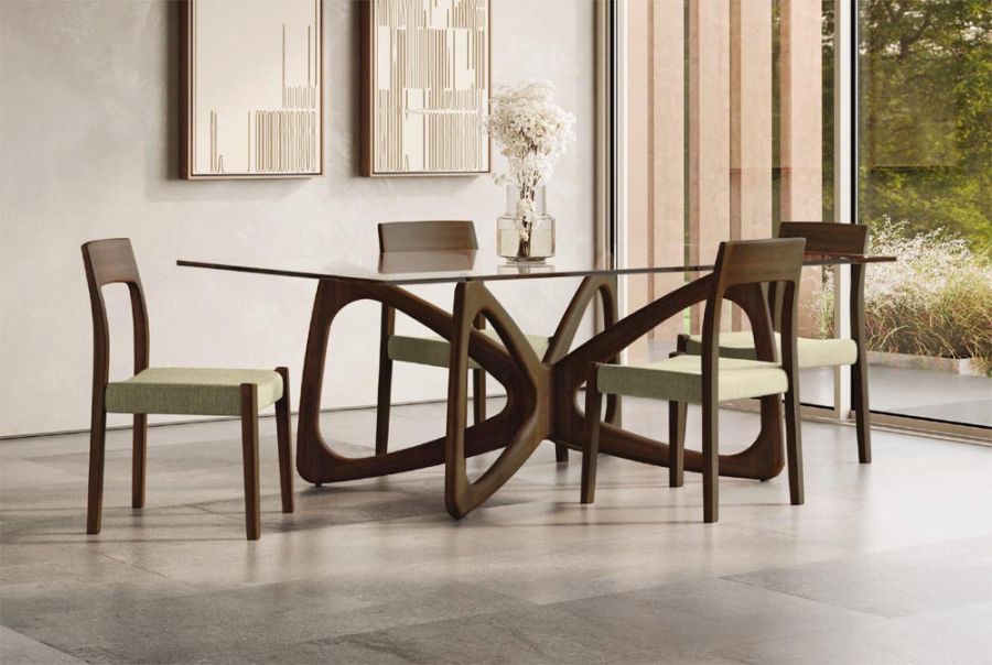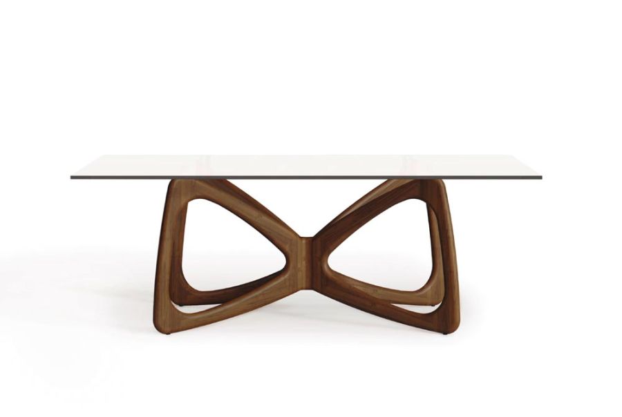 Butterfly Dining Room is crafted in solid American black walnut hardwood with natural finish and solid Oak in a range of finishes and topped with clear tempered 15 mm glass (glass tops are imported). Dining items in walnut are finished with a low sheen (10 sheen) topcoat. The finish is GREENGUARD Certified for low chemical emissions.