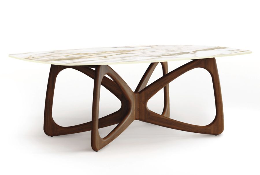 Butterfly Dining Room is crafted in solid American black walnut hardwood with natural finish and solid Oak in a range of finishes and topped with 12mm sintered stone top (sintered stone tops are imported). Dining items in walnut are finished with a low sheen (10 sheen) topcoat. The finish is GREENGUARD Certified for low chemical emissions.