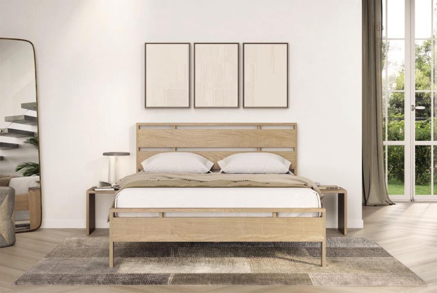 The Oslo Bedroom is crafted in solid oak hardwood and Made to Order in several finishes. The finish is GREENGUARD Certified for low chemical emissions. Products selected in Bright Oak display a variegated range of colors from blonde to light brown.