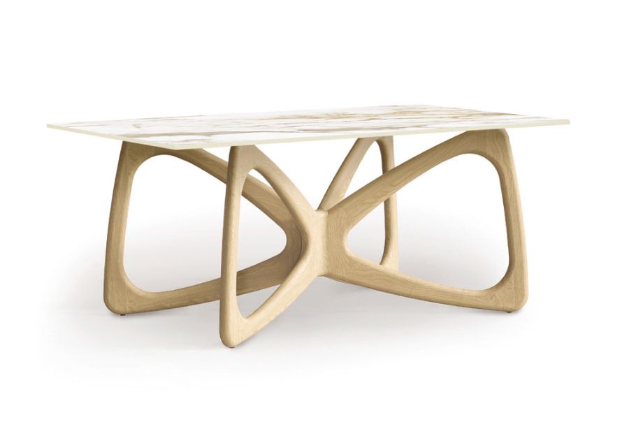 Butterfly Dining Room is crafted in solid American black walnut hardwood with natural finish and solid Oak in a range of finishes and topped with 12mm sintered stone top (sintered stone tops are imported). Dining items in walnut are finished with a low sheen (10 sheen) topcoat. The finish is GREENGUARD Certified for low chemical emissions.