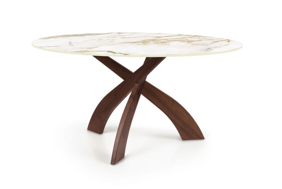 The Tables are crafted in solid American black walnut hardwood and topped with clear tempered 15 mm glass (glass tops are imported). Bases are also available in solid cherry in several finishes. Tables in walnut finished with a low sheen (10 sheen) top coat. The finish is GREENGUARD Certified for low chemical emissions. Table is topped with 12mm sintered stone top (sintered stone tops are imported).